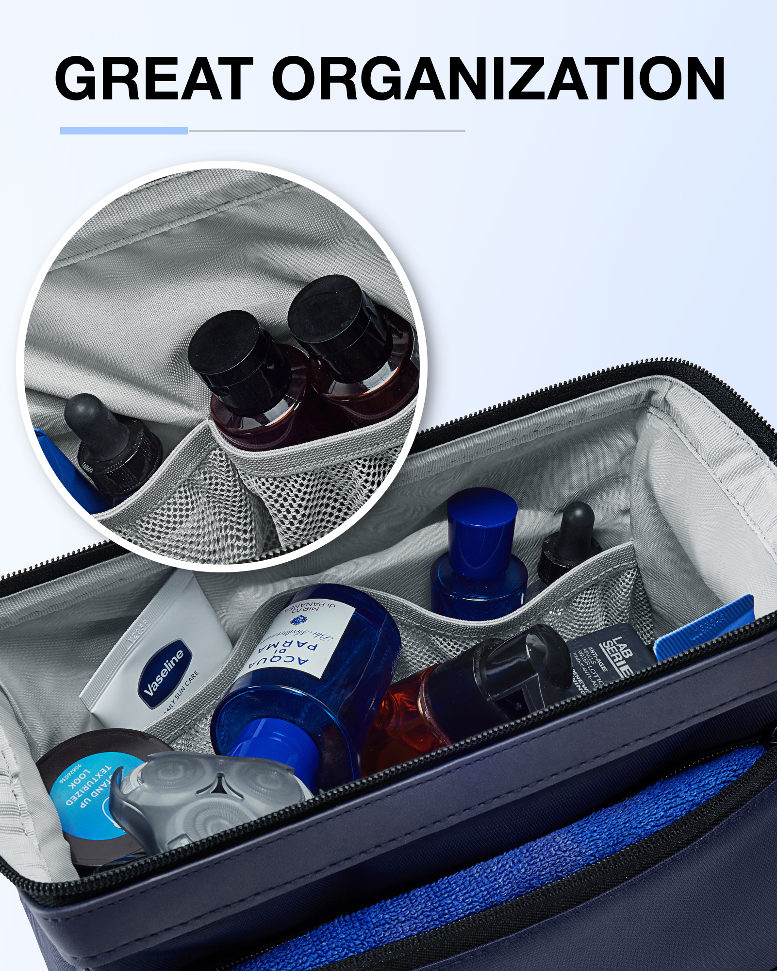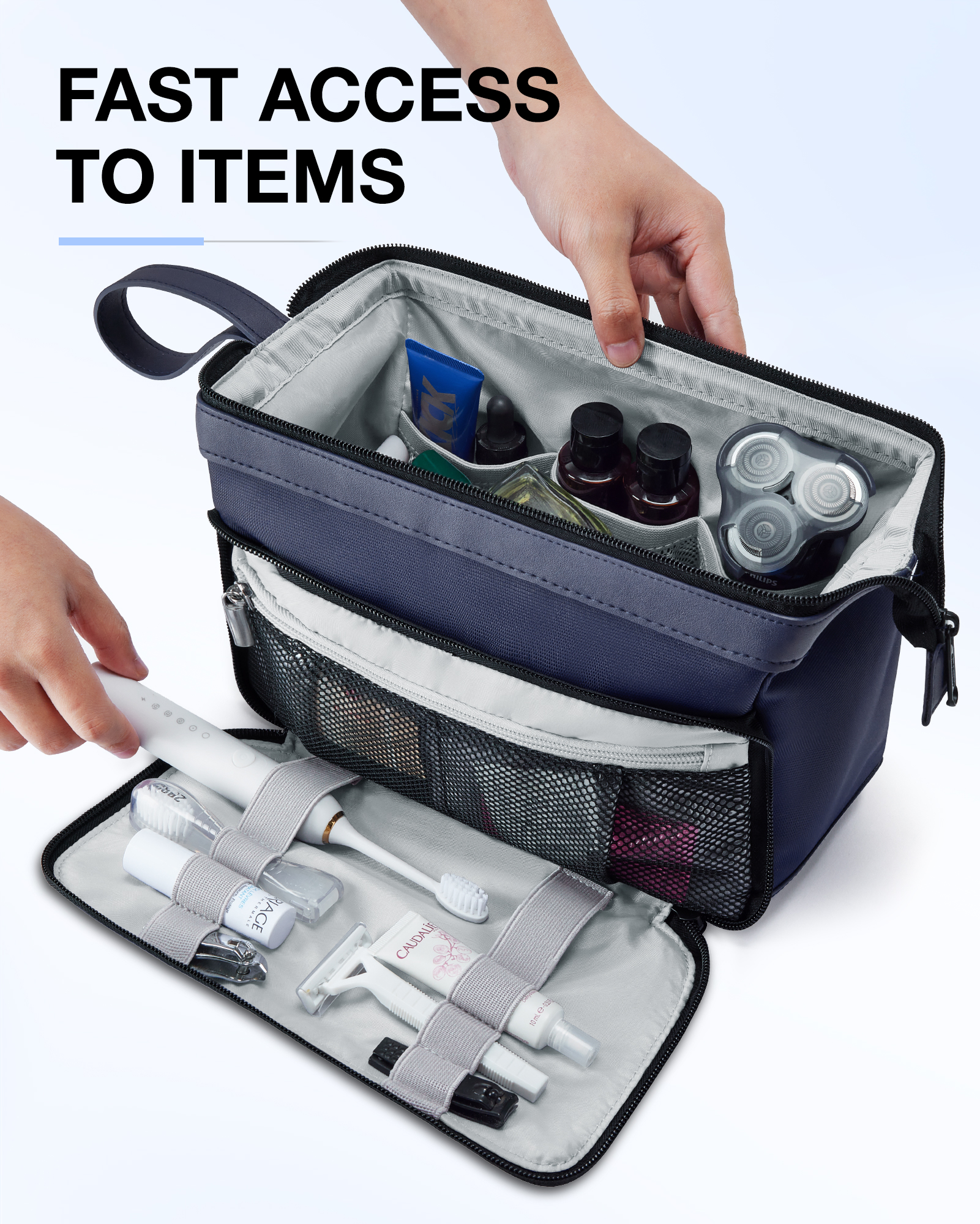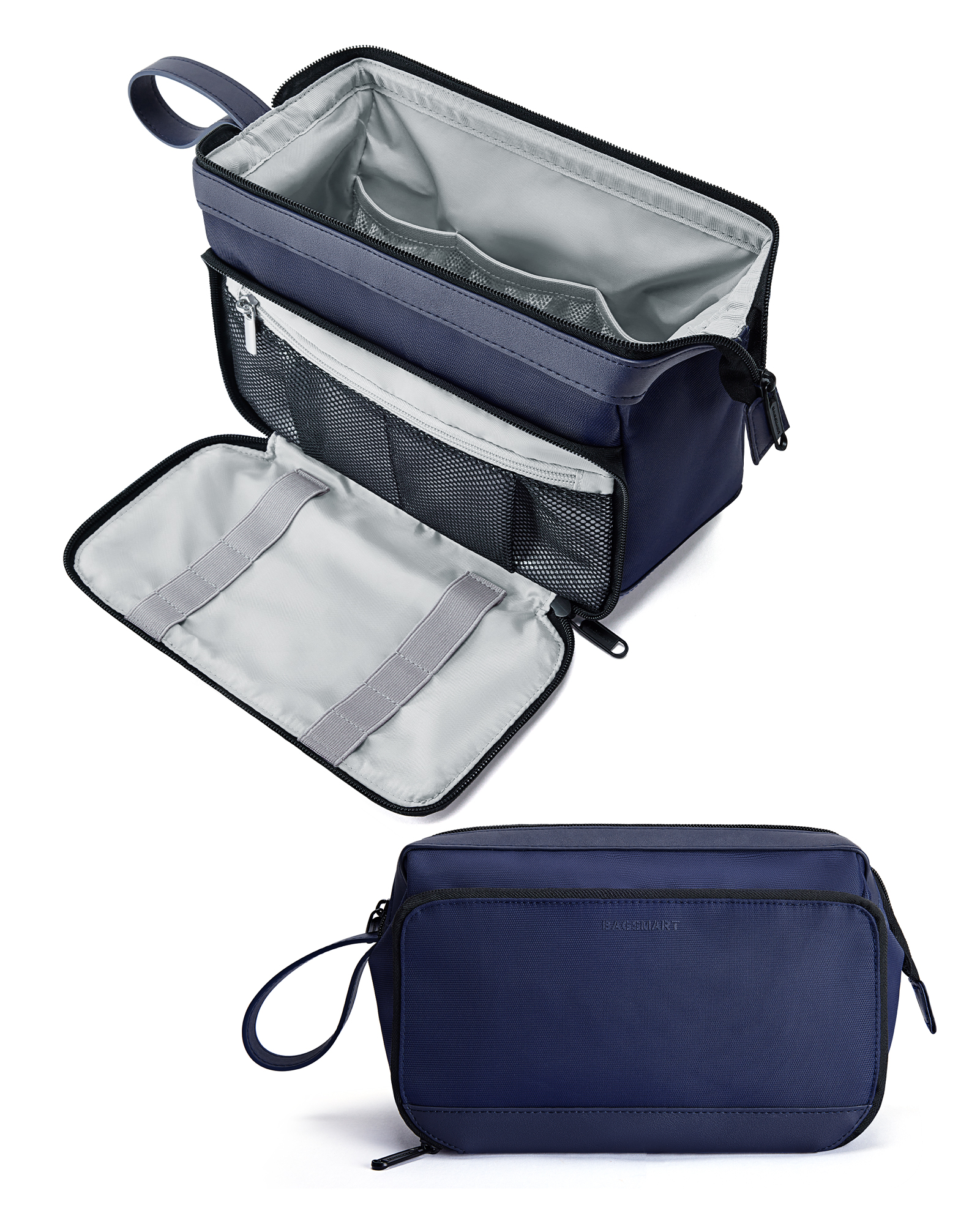 • Two-sided Zipper Pockets- Travel toiletry bag is made with dry wet separation waterproof PVC zipper pocket back and full-open zipper pocket front with elastic band and mesh zipper pocket to sort your tooth brushes, razors, electric trimmer or other small items.