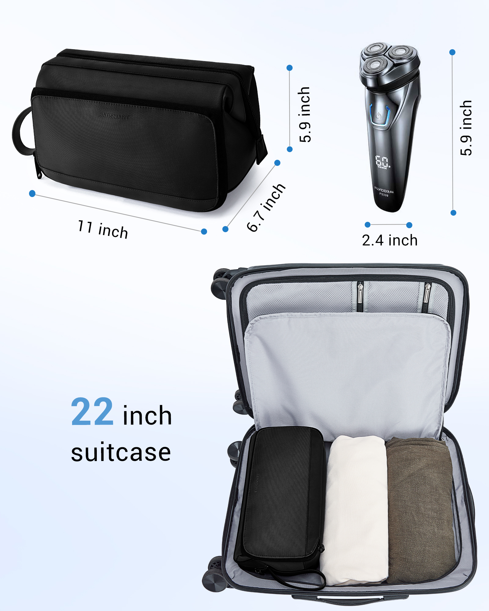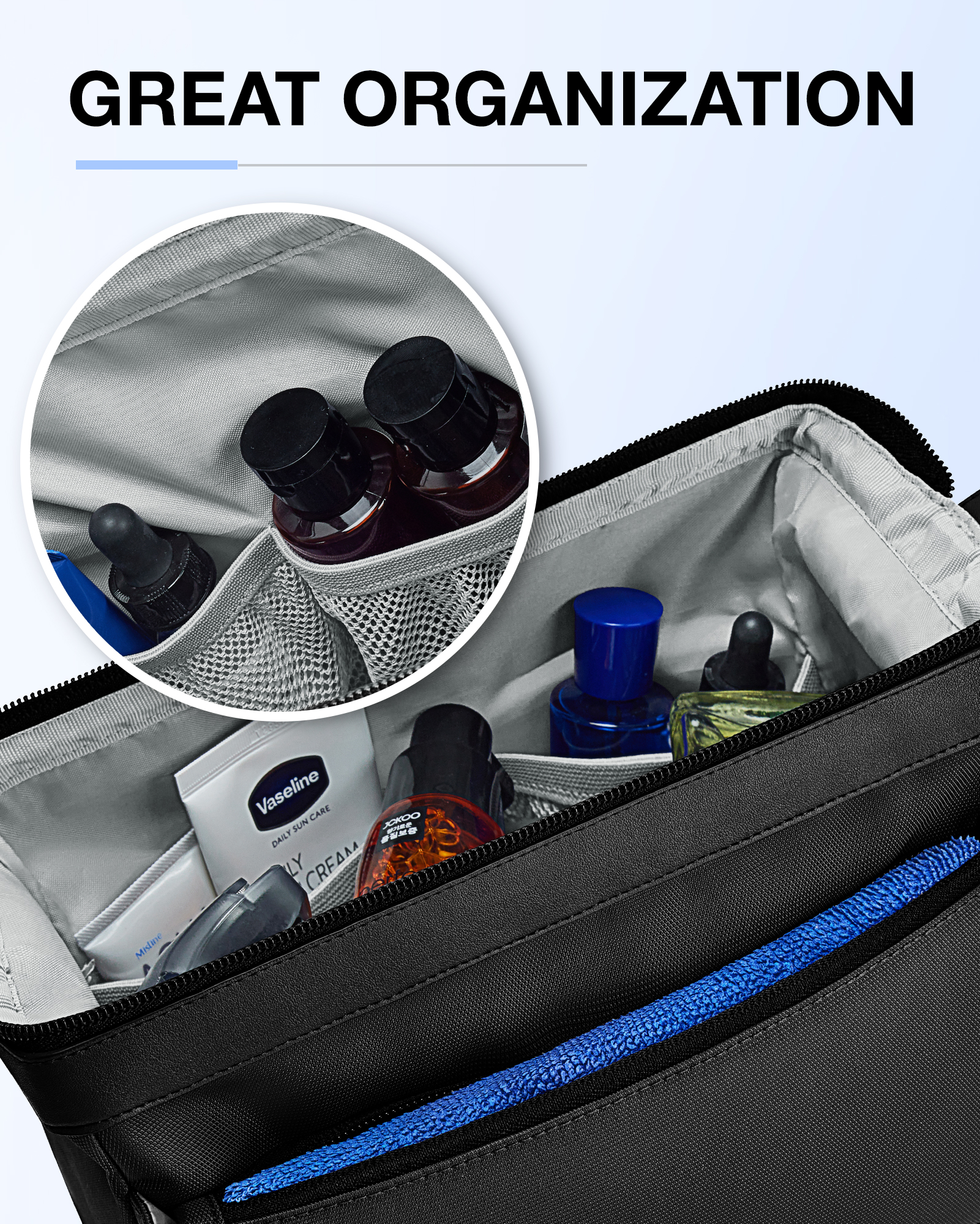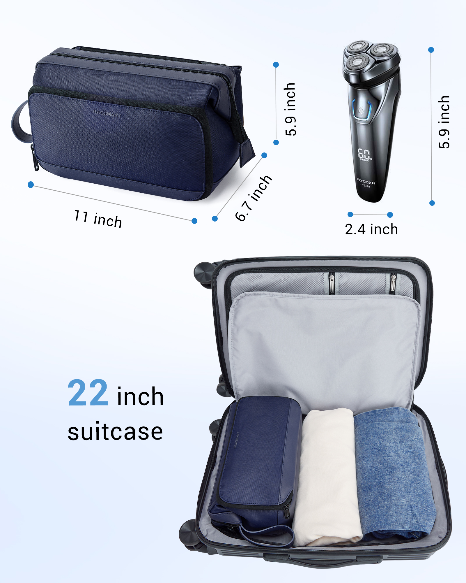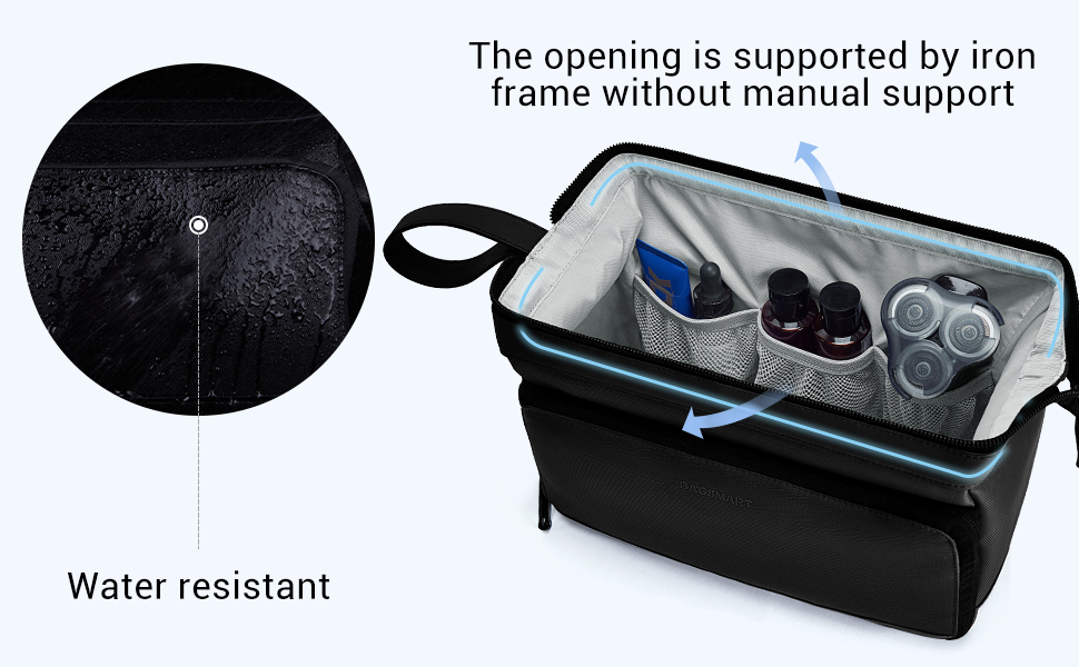 • Two-sided Zipper Pockets- Travel toiletry bag is made with dry wet separation waterproof PVC zipper pocket back and full-open zipper pocket front with elastic band and mesh zipper pocket to sort your tooth brushes, razors, electric trimmer or other small items.